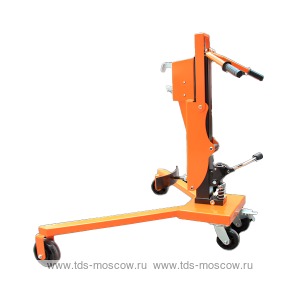 Ручная механическая тележка для перевозки бочек г/п 350 кг. Отличается высокой маневренностью и компактностью за счет особенности конструкции: задние колеса сдвоены, а передние расположены друг от друга на расстоянии 1200 мм, образуя трапециевидную фигуру. Бочка фиксируется специальным захватом, а затем с помощью рычага гидроузла поднимается на высоту до 320 мм.